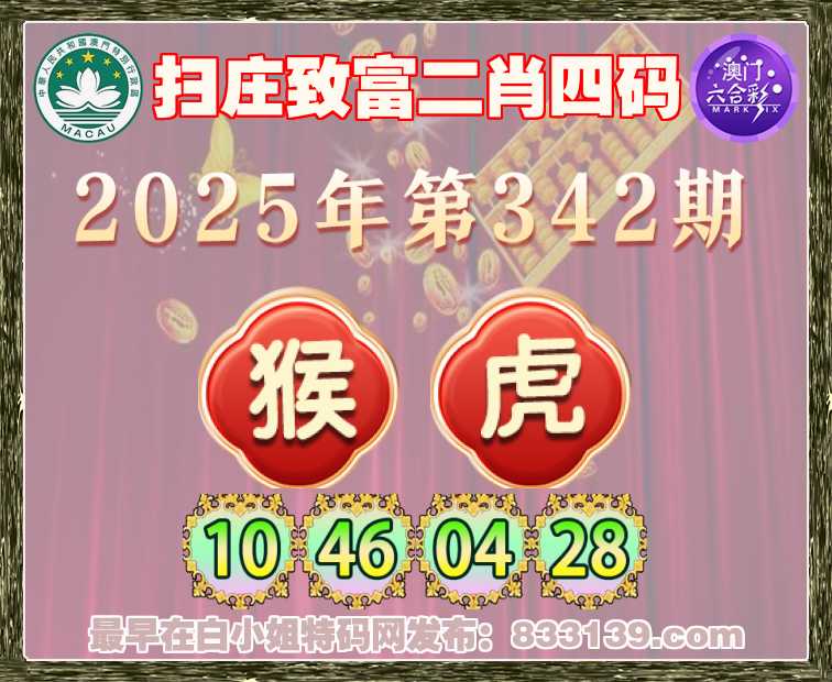 342期:『扫庄致富』 二肖四码【猴】【10.46.04.28】开:虎04