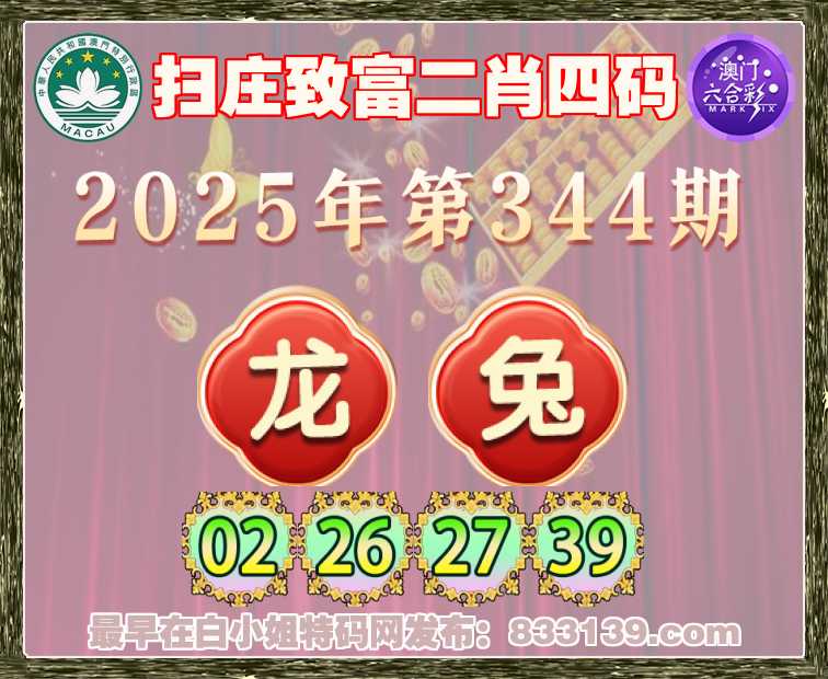 344期:『扫庄致富』 二肖四码【龙】【02.26.27.39】开:兔27
