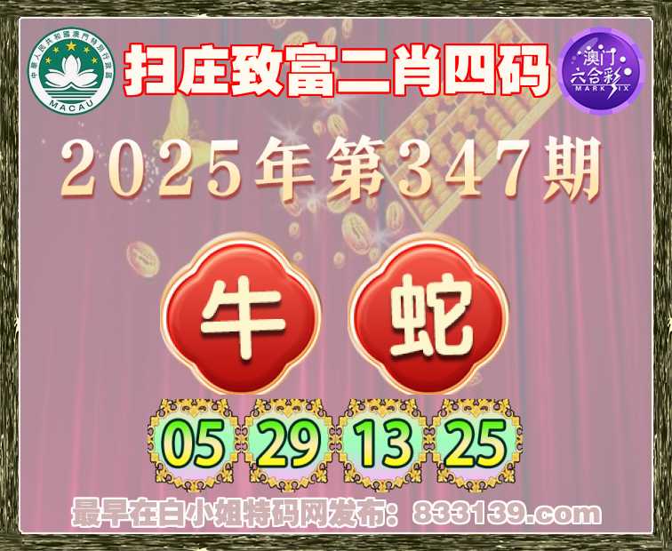 347期:『扫庄致富』 二肖四码【牛】【05.29.13.25】开:蛇13