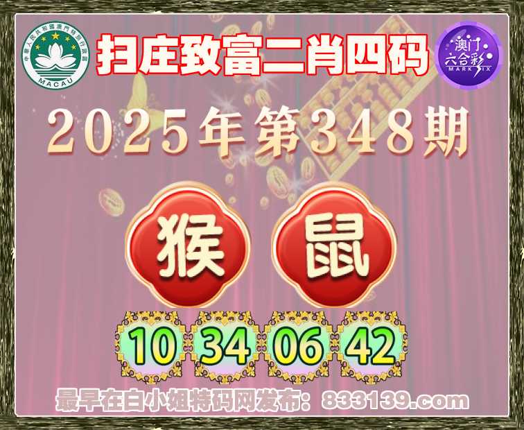 348期:『扫庄致富』 二肖四码【猴鼠】【10.34.06.42】开:虎16