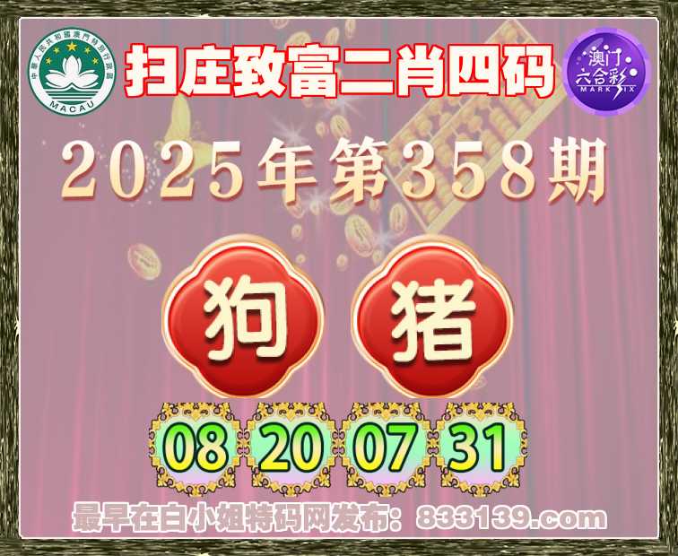 358期:『扫庄致富』 二肖四码【狗】【08.20.07.31】开:猪07